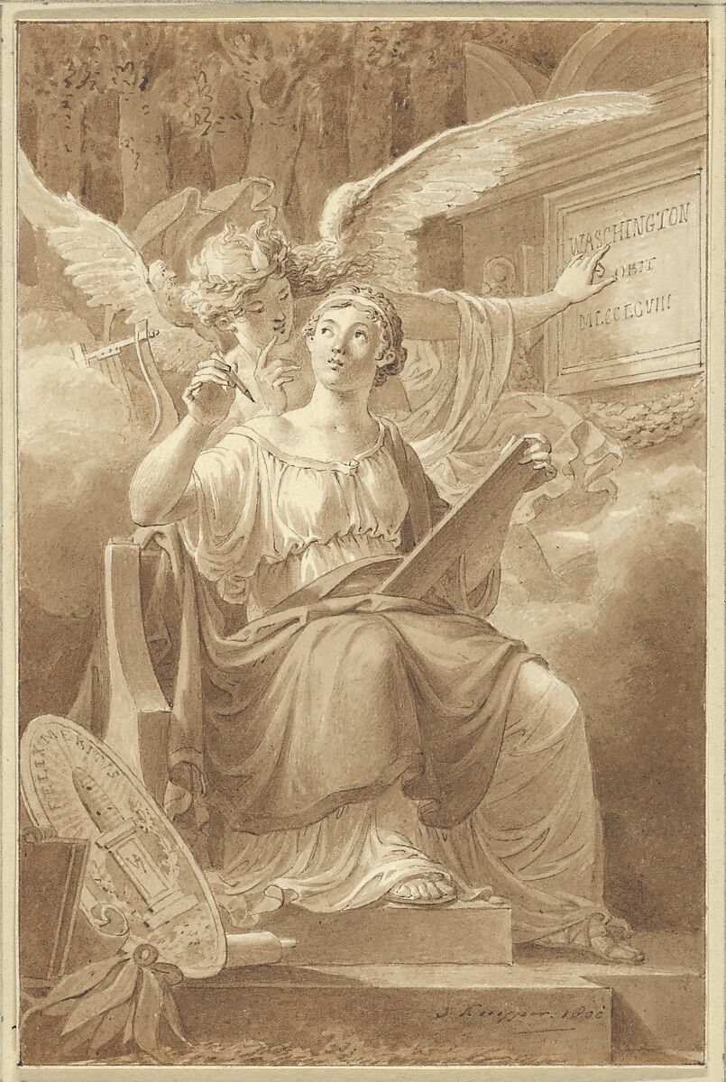 Jacques Kuyper produced this drawing as a frontispiece design for the printed edition of a eulogy composed upon the death of George Washington by the Dutch writer, philosopher, and lawyer Johannes Kinker (1764-1845).[1] The image appears to be an allegory of the creation of the eulogy, written in the form of a lyric poem—both ode and lament. The female figure seated beside Washington’s tomb holds a writing implement and a tablet, seemingly pausing to receive inspiration, or instruction, from the winged creature behind her gesturing toward the gravestone. Amidst the swirling clouds and streaming light, a lyre (symbol of lyric poetry) appears. At lower left is the seal of Amsterdam’s Felix Meritis Society, where Kinker delivered the eulogy in March of 1800. Established in 1776 to promote the arts and sciences, this society embraced the Enlightenment ideals with which Washington and his young nation were associated. Kuyper was also a member.