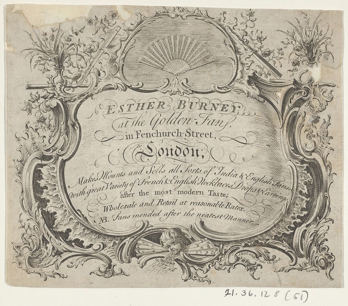 - Title: Trade card of Esther Burney, fan-maker