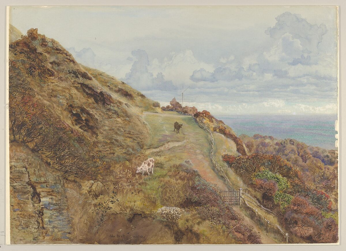 Precise natural details convey a dreamlike stillness in this Isle of Wight landscape, painted in the month of December. A sharply canted section of coastal down allows Brett to contrast purplish-gray rocks with pale grass and rusty winter foliage, as dappled touches of brilliant color describe a patch of distant sea. Wandering cows and a signal mast silhouetted against the sky suggest an unseen human presence. Brett was associated with the Pre-Raphaelites, and his early career had been molded by the leading critic John Ruskin, who acted as his mentor until a scientific argument caused a rift in 1865. While painted shortly after their parting, Bonchurch Downs still honors Ruskin’s famous advice that artists should "go to Nature in all singleness of heart . . . rejecting nothing, selecting nothing, and scorning nothing."