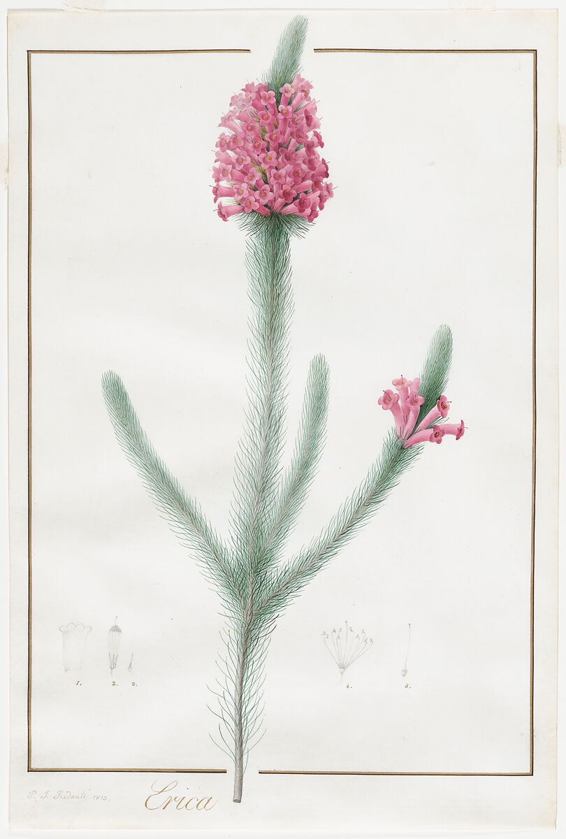 A watercolor on vellum of a flowering plant, Erica, commonly known as heath or heather. Redouté, a favorite of Empress Josephine, was the most famous botanical illustrator of the late 18th and early 19th century in France. His drawings of plants and flowers were well known through prints in luxury publications of the time. This delicate watercolor appears to be the model for plate 61 in Aimé Bonpland’s Description des plantes rares cultivées à Malmaison et à Navarre, published in Paris by Pierre Didot l’ainé in 1813.