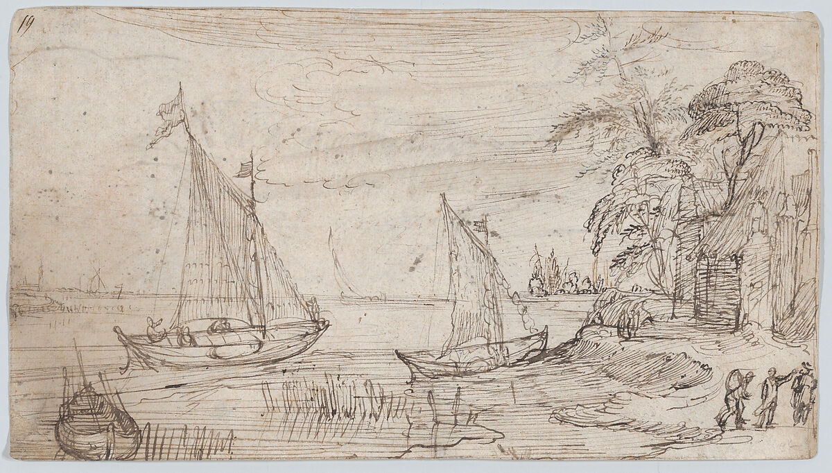 - Title: Riverscape with Two Sailboats and Several Figures; verso: A Mountainous Landscape near a River with a Horse-Drawn Barge and Several Figures