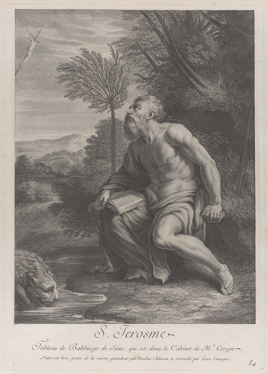 - Title: Saint Jerome seated by a tree looking up at a crucifix, a lion drinking water from a stream to his right