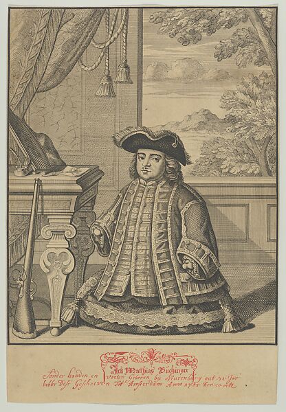 This work of art is currently on loan to the museum.The radiant red of the calligraphic inscription announces the itinerant Buchinger’s sojourn in Amsterdam in 1705. This is the first print signed by Buchinger, who at the time was already thirty-one and married to his first of four wives. It shows the performer wearing a tricorn hat and standing on an ample cushion before an ornate table littered with the objects of his exhibitions: a quill and inkpot, a drawing of a flower, a dulcimer-like instrument (the German hackbrett), and a pair of dice. These objects, along with the rifle leaning against the table, demonstrate Buchinger’s range of skills and reappear in the vignettes in an etching by Elias Baeck.