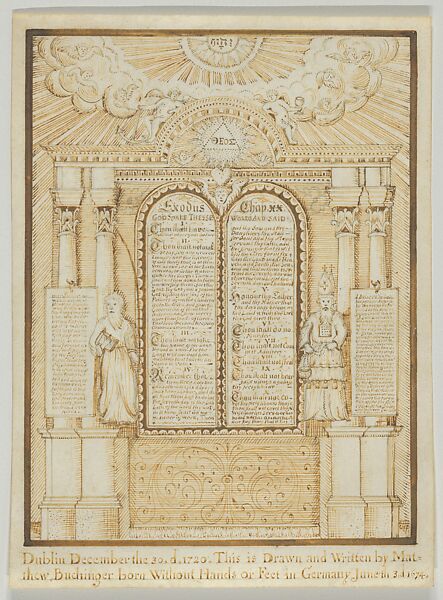 This work of art is currently on loan to the museum.Buchinger spent nearly twenty-two years in the British Isles, traversing England, Scotland, and Ireland. 1720 marks the start of his residency in Ireland; his third wife, Ann Kemelmeyer, died in Galway in January of 1722, and he quickly remarried Ann Teys in Belfast in July. This diminutive Decalogue with the Lord’s Prayer and Apostles’ Creed is incredibly deliberate in its rendering, suggesting that Buchinger might have used a straight edge or a compass. Also visible in this work are graphite flowers framing the two tablets of Moses and parallel shading lines in the garments of the prophets that were either never executed by Buchinger in pen and ink or erased to mask the process of making.