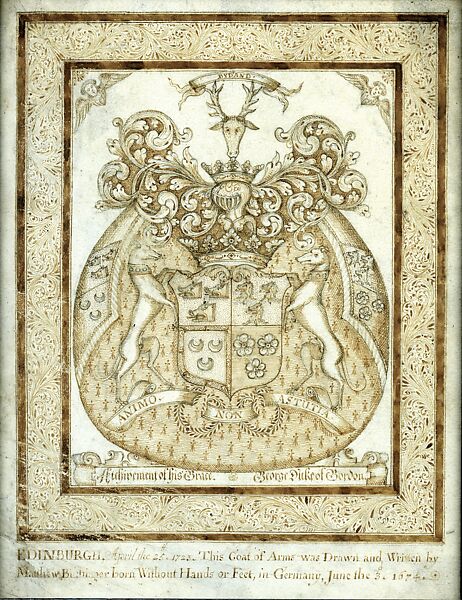 This work of art is currently on loan to the museum.After London advertisements billed him as “The Famous Mr. Buchinger” in 1722, Buchinger made his initial appearances in Edinburgh in 1723. This coat of arms was likely made for Cosmo George Gordon, the third Duke of Gordon, born 1720, who was also known as the Earl of Norwich and Baron Gordon of Huntly. He was the chief of Clan Gordon, whose mottos Bydand (Steadfast) and Animo non Astutia (Courage not by Craft) are included in the coat of arms, which is meticulously sketched in graphite and drawn over in pen and brown ink.