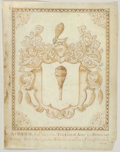 This work of art is currently on loan to the museum.In the fall of 1733, Buchinger exhibited in Norwich, quite possibly at the Angel, a hostelry known for exhibitions of “monsters, freaks, and marvels.” Situated in Norwich’s marketplace, Buchinger would, with his “admirable dexterity,” draw from life, create coats of arms, play a variety of instruments, and perform “other curious diversions, to the general satisfaction of all spectators.” This coat of arms, which currently remains unidentified, may have been an example of one of Buchinger’s common motifs that he then signed and personalized at a public appearance. Buchinger’s characteristic calligraphic signature, with its mirrored and upside-down lettering, could have similarly been done on the spot to demonstrate his skills. The inscription, “This was written by Matthias Buchinger born without hands or feet 1674 Germany,” can be found in many works and in multiple languages, tracing Buchinger’s travels across Western Europe.