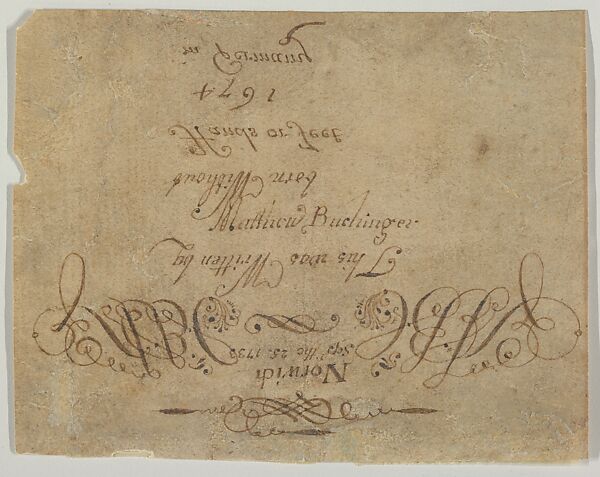 This work of art is currently on loan to the museum.In the fall of 1733, Buchinger exhibited in Norwich, quite possibly at the Angel, a hostelry known for exhibitions of “monsters, freaks, and marvels.” Situated in Norwich’s marketplace, Buchinger would, with his “admirable dexterity,” draw from life, create coats of arms, play a variety of instruments, and perform “other curious diversions, to the general satisfaction of all spectators.” This coat of arms, which currently remains unidentified, may have been an example of one of Buchinger’s common motifs that he then signed and personalized at a public appearance. Buchinger’s characteristic calligraphic signature, with its mirrored and upside-down lettering, could have similarly been done on the spot to demonstrate his skills. The inscription, “This was written by Matthias Buchinger born without hands or feet 1674 Germany,” can be found in many works and in multiple languages, tracing Buchinger’s travels across Western Europe.f