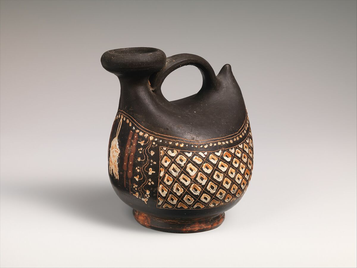 These two flasks, 2015.641 and 2015.642, undoubtedly for oil, have been known since the early 1880's, when they were purchased by the noted British archaeologist Augustus Henry Lane Fox Pitt-Rivers. They remained with his descendants until 1992. Documentation indicates that they were found together at Capua, a major center in the Italian region of Campania. However, the technique of decoration, in which color is applied onto the vase, points to neighboring Apulia as the place of production. The simple motifs are adapted with exceptional sureness to the irregular surfaces of the respective shapes. Under the spout, the askos additionally shows a suspended theatrical mask between ribbons and ivy leaves, popular details associated with the wine god, Dionysos.