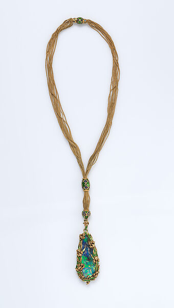 This superb sautoir, consisting of a multi-strand gold foxtail-link chain and a large pendant opal, is marked by the New York firm of Marcus & Co., whose reputation at its prime rivaled that of Tiffany & Co. Herman Marcus (1828–99), a German–born and Dresden–trained jeweler, arrived in New York in 1850 and worked for a number of prestigious firms before establishing Marcus & Co. in 1892. Following his death, the company continued under the direction of his two sons, George Elder Marcus and William Marcus. The magnificent drop-shaped black opal, with its textured surface and striations, is enclosed in a surround of enameled gold iris blossoms and leaves that continues onto the back of the pendant. This inventive design reflects the Arts & Crafts aesthetic and parallels the naturalistic work of Louis Comfort Tiffany (1848–1933).