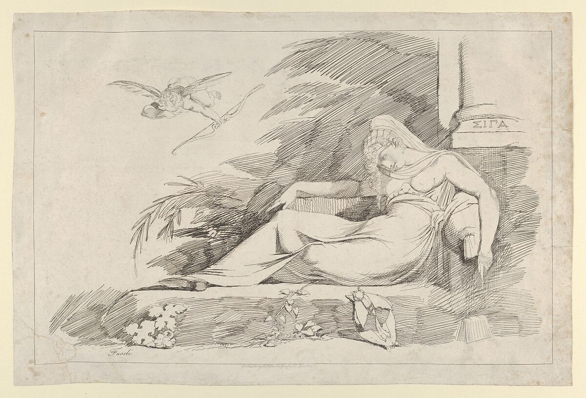 Fuseli himself etched this mysterious erotic image of a woman dozing on a cushioned divan. She wears a classically styled gown that exposes her breasts and has been hit by an invisible arrow released by Cupid, who hovers at upper left. Her dropped book rests near mating butterflies and Greek letters on a pillar translate as "Silence" or "Hush," warning us not to disturb the sleeper's dreams.