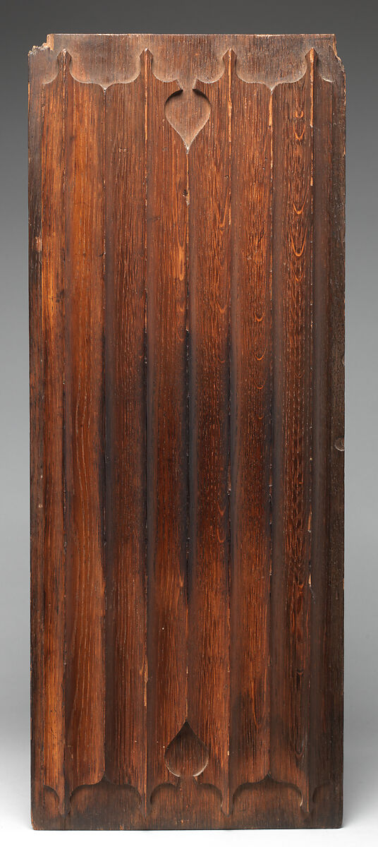 These decorative oak panels exemplify the designs of A.W.N Pugin, who was the leading exponent of the Gothic Revival style in England. Pugin’s work is central to the transformation in British design that began in the mid-nineteenth century. He admired what he saw as the honesty and purity of medieval art, and deplored the meaningless repetition of historical motifs. Pugin coined the phrase “Brumagen Gothic,” referring to “those inexhaustible mines of bad taste, Birmingham.”