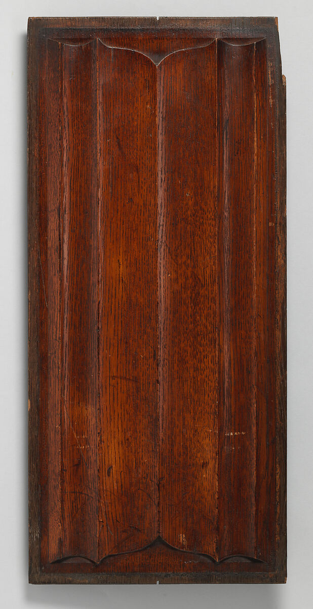 These decorative oak panels exemplify the designs of A.W.N Pugin, who was the leading exponent of the Gothic Revival style in England. Pugin’s work is central to the transformation in British design that began in the mid-nineteenth century. He admired what he saw as the honesty and purity of medieval art, and deplored the meaningless repetition of historical motifs. Pugin coined the phrase “Brumagen Gothic,” referring to “those inexhaustible mines of bad taste, Birmingham.”