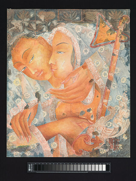 The lovers, arms entwined, are seen bound together by a transparent embroidered shawl which wraps the woman and man together in a tender embrace. The artist has skillfully exploited the translucency of the watercolor medium to full effect. Signature motifs, such as the sacred goose—the Buddha’s messenger, the hamsa—seemingly embroidered in the shawl’s border design, reference both Sinhalese culture and Buddhism, the two strands central to Manjusri’s life, as both a monk and a householder artist.