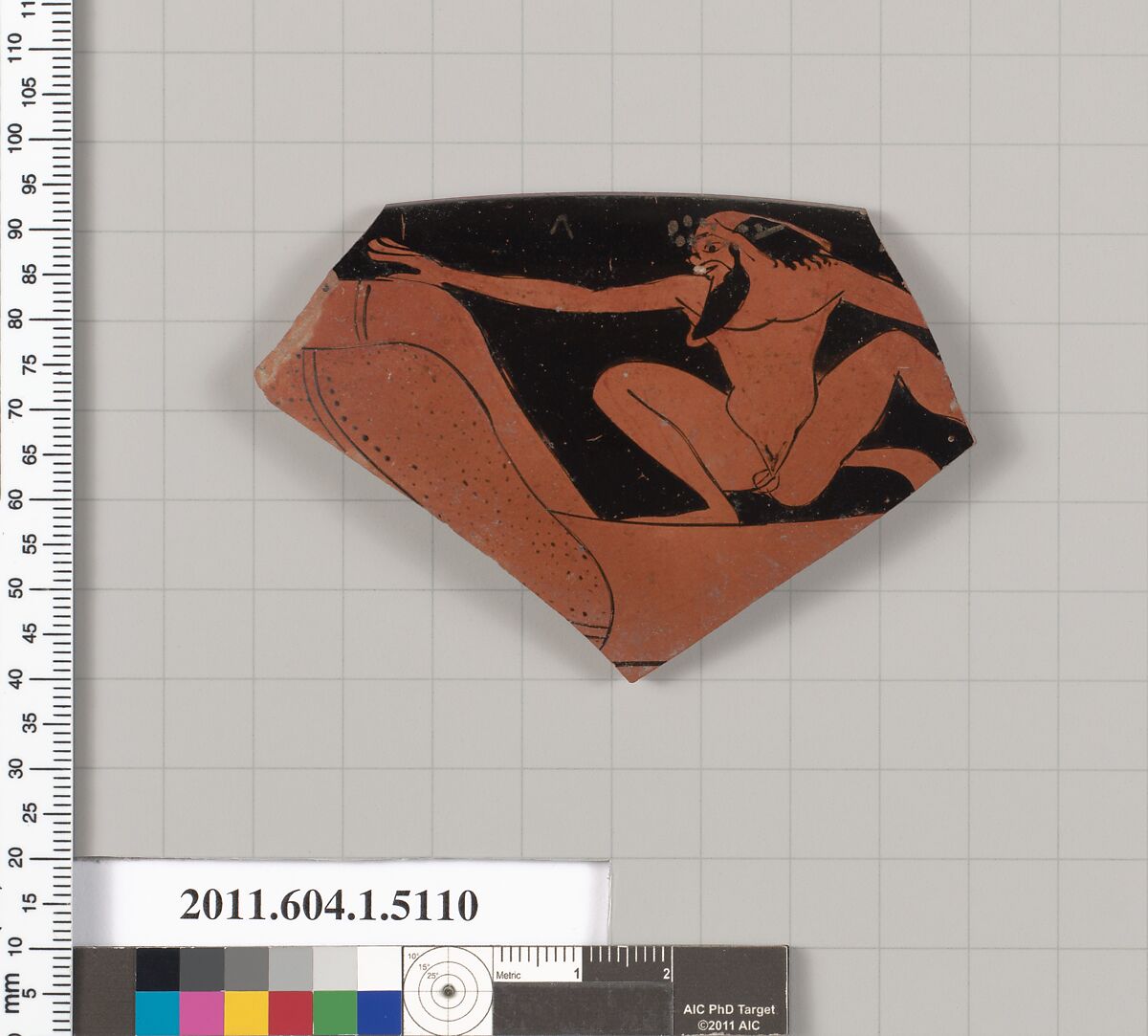 Exterior, wreathed satyr crouching on the neck of a phallus bird?; one letter of an inscription, L