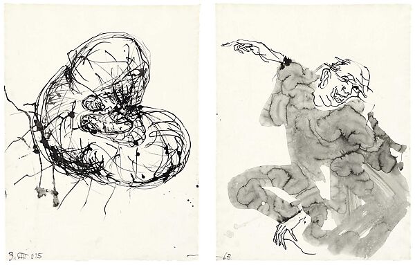 A pioneering figure of Neo-Expressionism in the 1980s, Georg Baselitz remains one of the major proponents of figuration in contemporary art. In this diptych—part of a larger series of ink and watercolor drawings referred to as "Visit from Hokusai"—Baselitz interprets a self-portrait drawn by the Japanese artist Katsushika Hokusai (1760-1849) on the right, while he interprets his own earlier abstract image on the left. Like Hokusai at the time of his self-portrait, Baselitz made these drawings when he was in his eighties, perhaps as a reflection on his own legacy: by using animated lines and playing with the distinction between figure and ground, he draws our attention to the process and language of drawing, and also its expressive capacities, which has been a hallmark of his long career.
