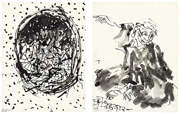 A pioneering figure of Neo-Expressionism in the 1980s, Georg Baselitz remains one of the major proponents of figuration in contemporary art. In this diptych—part of a larger series of ink and watercolor drawings referred to as "Visit from Hokusai"—Baselitz interprets a self-portrait drawn by the Japanese artist Katsushika Hokusai (1760-1849) on the right, while he interprets his own earlier abstract image on the left. Like Hokusai at the time of his self-portrait, Baselitz made these drawings when he was in his eighties, perhaps as a reflection on his own legacy: by using animated lines and playing with the distinction between figure and ground, he draws our attention to the process and language of drawing, and also its expressive capacities, which has been a hallmark of his long career.