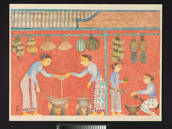 Four women dressed in traditional waist-shirts (Sinh. tuppotiya) and long sleeved blouses, prepare food in an open kitchen with red interior walls, blue beams and a tiled roof. On the right two girls prepare coconut milk: one sits on the coconut scrapper whilst the other holds a machete for splitting the nut. To the left two women are pouring a liquid, likely the coconut milk, through a strainer into a large earthenware cooking pot set on rocks over a fire. An array of fresh fruits hangs from the rafters. The four woman all wear skirts decorated in the traditional Sri Lankan manner, with a saw-tooth patterned front panel (tumpal) and floral repeat patterns on the central ground.