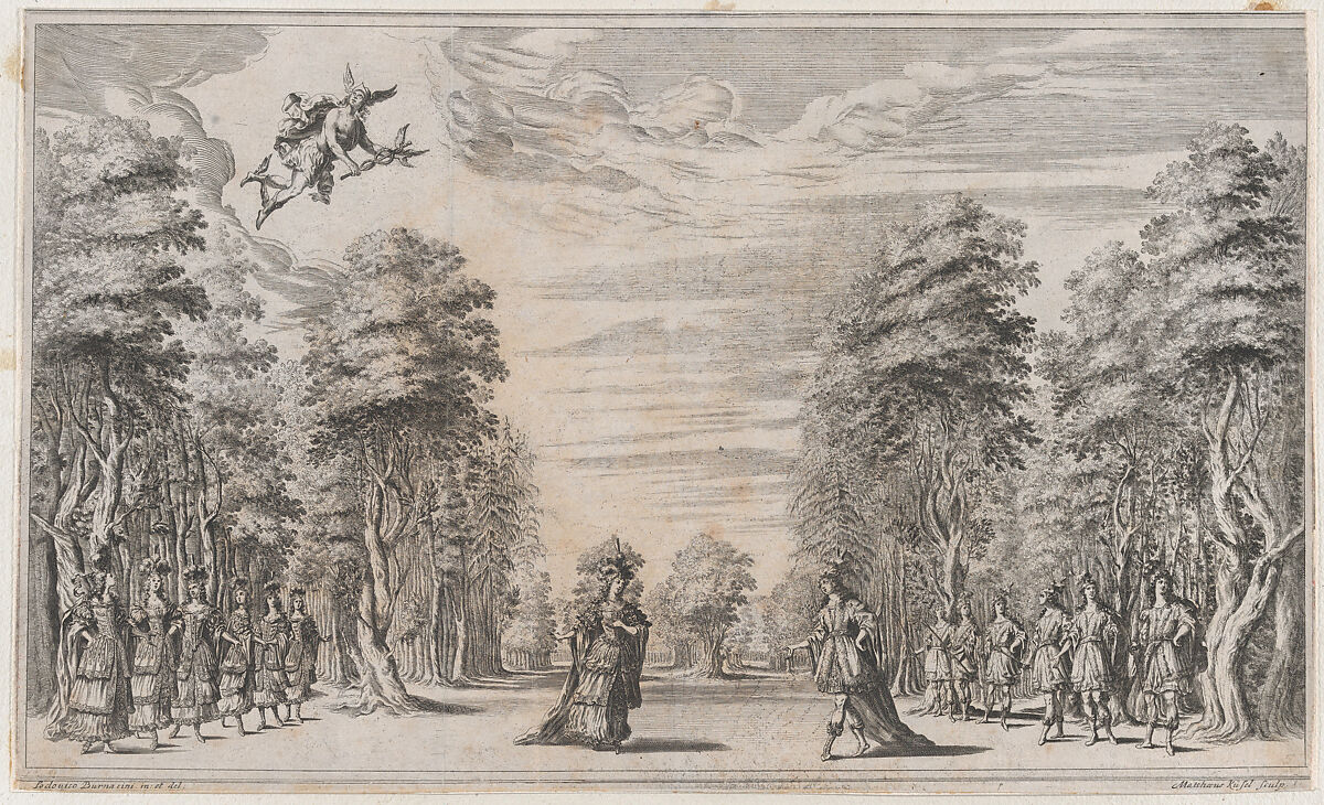 The fourth of the twenty-three stage sets designed by Lodovico Burnacini for 'Il Pomo D'Oro, Festa Teatrale Rappresentata in Vienna Per L'Augustissime Nozze Delle Sacre Cesaree E Reali Maestà Di Leopoldo E Margherita', an opera celebrating the wedding of Emperor Leopold I and Margarita Teresa of Spain in 1666. Composed by Antonio Cesti with a libretto by Francesco Sbarra, it was first performed in July 1668 at the Theater auf der Cortina—also designed by Burnacini.