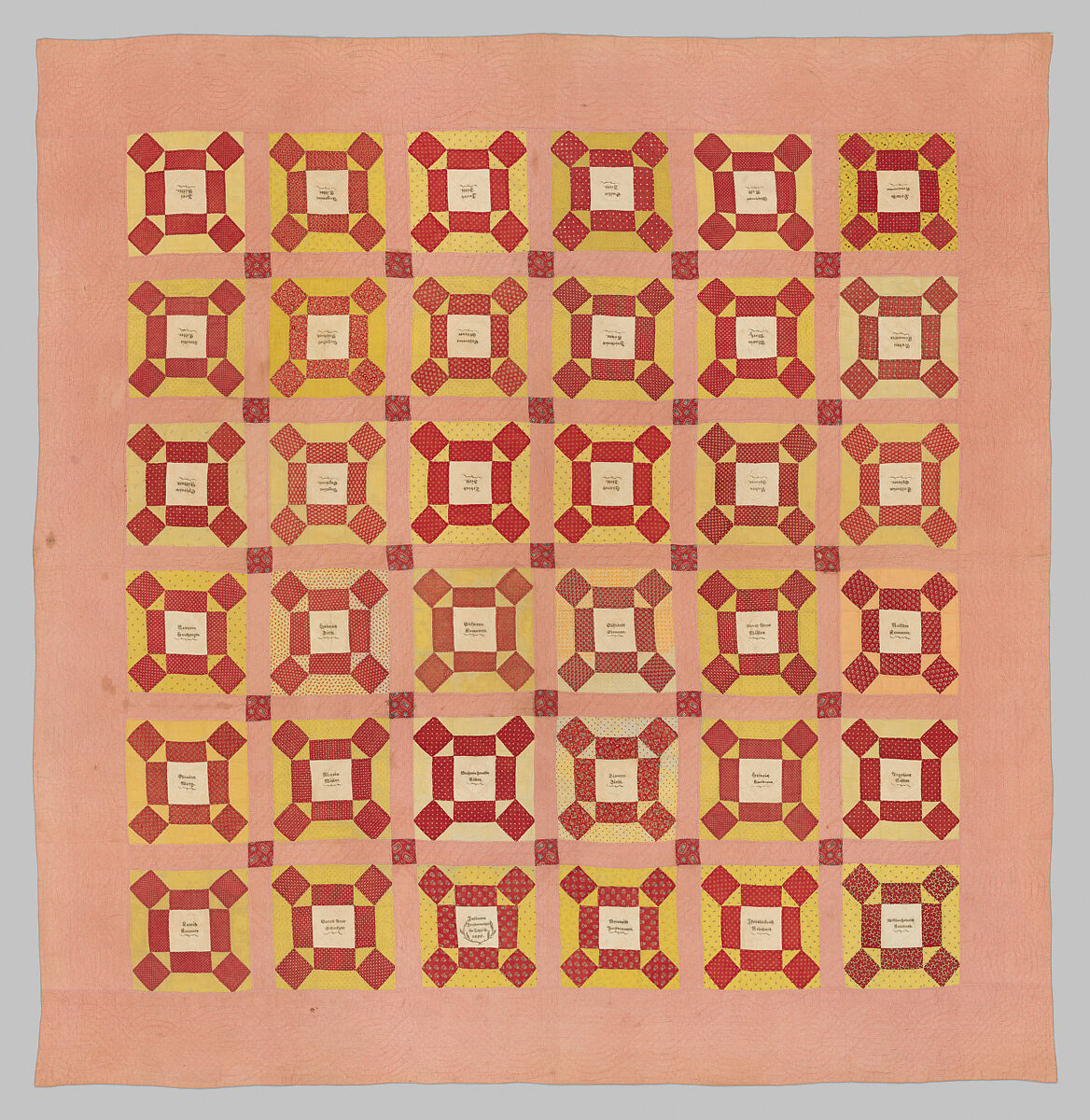 This quilt is made up of six blocks across and six blocks down, surrounded by a border and sashing of red printed pattern on white ground. Each block has a central square of white cotton fabric that is inscribed in black ink with a person’s name underlined with a flourish, all in the same hand.
