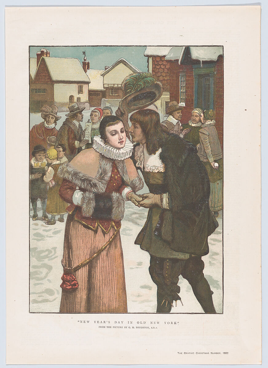 Boughton made his name with American colonial subjects and exhibited examples in London and New York from the 1860s through the 1890s. The present image from 1882, imagines New York shortly after the British took over from the Dutch in 1675 (in 1876 Boughton had painted "New Year’s Day in New Amsterdam," set around 1640). "The Graphic" chose this subject for a color-printed wood engraving, one of those they published annually as a premium for readers at Christmas, and the image centers on a young man who lifts his plumed hat to kiss a young woman wearing a ruff, fur-edged cape and muff. On April 3, 1870 "Harper's Weekly" reissued the print in New York, an indication of how British prints were often quickly recirculated by American publishers.