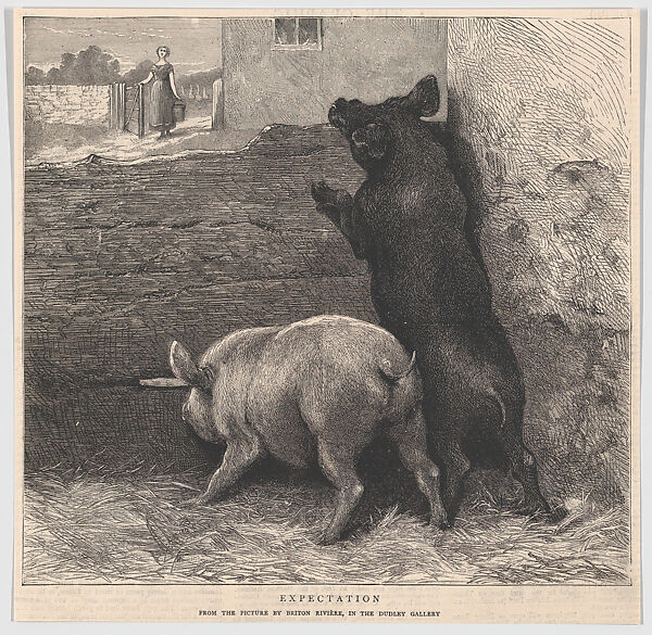 Rivière here offers us a pig's eye view of two eager sty-mates eagerly awaiting their next meal, brought by a girl who approaches with a bucket. The contrasted light and dark coats silhouetted against the varied textures of fence and wall enlivens the image and suggests that the subjects have distinct personalities. Rivière had painted historical dramas before beginning to focus on animals from the mid-1860s, taking a genre popularized by Sir Edwin Landseer in new directions. The painting related to this wood engraving was shown at the Dudley Gallery in the Egyptian Hall on Piccadilly in 1871, as the artist's reputation was rising (he would become an Associate of the Royal Academy in 1878, full Academician in 1881, and narrowly miss being elected President in 1896).