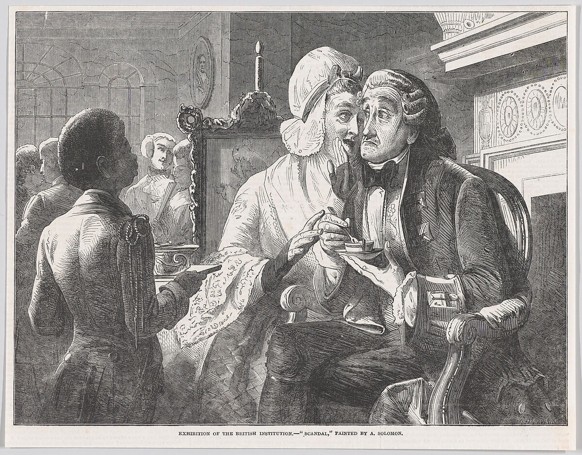 Abraham Solomon came from a Jewish family whose father's business success enabled three of his children to become artists (the others were Rebecca and Simeon). Made when Abraham was in his twenties, this composition centers on an elderly eighteenth-century couple who amuse themselves with tea and gossip, since no longer able to dance or flirt like the younger figures in the background. The artist became known for images that describe emotional or sentimental encounters within detailed interiors. The satirical element here recalls literary sources such as the novels of Henry Fielding. "Scandal" was shown at the British Institution in 1851 and engraved by Heaviside for the "Illustrated London News."
