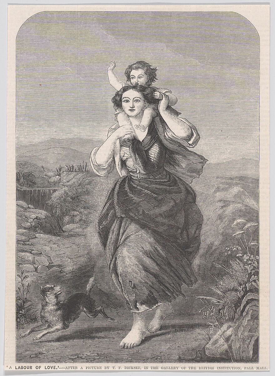 A student of Henry Perronet Briggs, Dicksee came from a family of artists and exhibited at the Royal Academy from 1841 through 1895. He specialized in historical and genre subjects and often portrayed actors in roles. Between 1873 and 1895 the artist produced a series of evocative full-length depictions of leading female characters from Shakespeare, shown within landscapes, including "Ophelia" (1875), "Juliet" (1875), "Cleopatra" (1876), and "Miranda" (1895). The present representation of a young woman who joyfully carries a young boy through a rocky Welsh landscape anticipates those dramatic works, and was shown by Dicksee at the British Institution in 1860, then engraved for the "Illustrated News of the World."