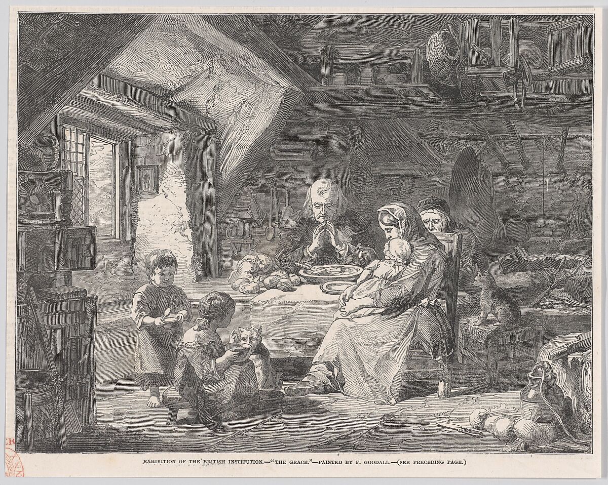 As a family gathers to eat in a humble room, a grandfather blesses the food next to his wife, as a younger woman holds a baby in her lap, and two children sit quietly in the foregound. Thomas's wood engraving reproduces a painting by Frederick Goodall, the second son of the skilled line engraver Edward Goodall. As a child, Frederick and his siblings had been encouraged to pursue art by John Ruskin, Clarkson Stanfield, David Roberts, and J.M.W. Turner. At sixteen, Goodall showed four commissioned watercolors at the Royal Academy, then won a silver medal at the Society of Arts for an oil painting. This early success allowed visits to Brittany and Ireland, and led him to depict rustic village subjects influenced by David Wilkie. In 1852, Goodall was elected an Associate of the Royal Academy. An extended trip to Egypt in 1858 set his subsequent career on a different course.