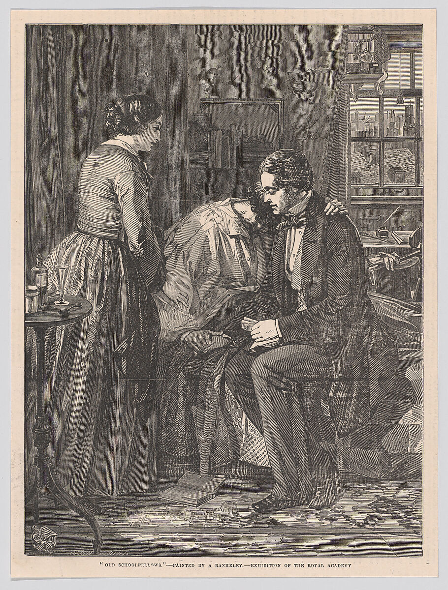 A man confined to bed in humble surroundings gratefully embraces a visitor whom, the title indicates, he has known since childhood. Rankley's related painting was exhibited at the Royal Academy in 1855 with a quote from Proverbs (17.17) in the catalogue "A friend loveth at all times, and a brother is born for adversity." This suggests that the well-to-do visitor has responded to his friend's plight with concrete generosity, and close inspection of the image reveals a bank note offered in his left hand.