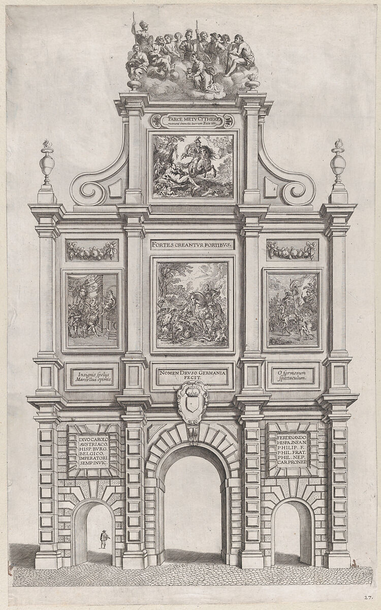 - Title: Plate 27: Triumphal arch, elevation of the back, surmounted by allegorical figures and decorated with scenes from Roman mythology and history; from Guillielmus Becanus's 'Serenissimi Principis Ferdinandi, Hispaniarum Infantis...'