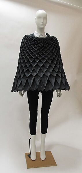 As a designer for Comme des Garçons, Junya Watanabe excelled by fusing Kawakubo's confrontational approach to traditional form with his own interest in historicism. Watanabe's fall/winter 2015 collection, which explores dimensionality through clothing, recalls the concertina pleated garments presented in his fall/winter 2000 collection, “Techno Couture”. This cape, created entirely of collapsible, inverted honeycomb pleats in wool jersey, is reminiscent of Pierre Cardin's "Cardine" dresses of the late 1960s. While Cardin pleated the textile using heat and metal molds, Watanabe achieves a similar effect using traditional sewing techiques.