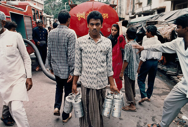 Singh, a pioneer of color street photography, worked and published prolifically from the late 1960s until his sudden death, in 1999. Born into an aristocratic family in Rajasthan, Singh was a thoroughly cosmopolitan artist. He lived abroad for most of his adult life—in Hong Kong, Paris, London, and New York—but his eye was perpetually drawn back to his native India. Working with a handheld camera and color slide film, he recorded the country’s dense milieu in complex, frieze-like compositions teeming with incident, fractured by reflections, and pulsating with opulent color. In the early 1990s, Singh turned his attention to Bombay (now Mumbai), India’s bustling capital of commerce on the Arabian Sea. The street scenes he made there seem to radiate energy, as if the elements are held in suspension by centripetal force. Hands, gestures, and gazes swirl around a still center point, usually anchored by an individual who either pointedly ignores the camera or stares back at it with confrontational directness, as in this portrait of a dhabawalla, who delivers lunch to workers around the city. This print is part of a group of