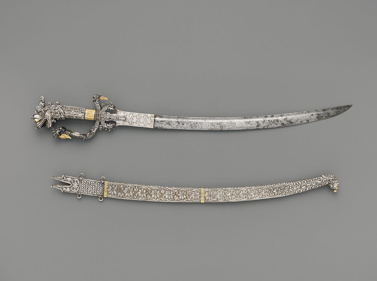 The uniqueness of this Sinhalese sword type lies in the elaboration of decoration, with the bejeweled lion’s head hilt superbly modelled and detailed, with gold-set gemstones in the eyes. The animal terminals on the pommel, cross guards and knuckle guard have a long Indian tradition as well as existing in European weaponry, so the inspiration for the Sri Lankan version is likely a fusion of these disparate influences. The two cross guards (quillons) are in the form of projecting yali, part-lion, part-bird (serapendiya), of which one guard returns to join the hilt as the knuckle guard. Details are reserved in gold, and include vegetal flames that hang pendant from their open jaws. The grip is octagonal with alternating patterns. The scabbard is finely decorated with a diaper pattern register with four rings for attaching to a belt, followed by scrolling vegetal and floral patterned repeats, interrupted at intervals by two gold bands, and culminating in open jaws of a mythical creature (kirtimukuta-yali) emerging from foliage.