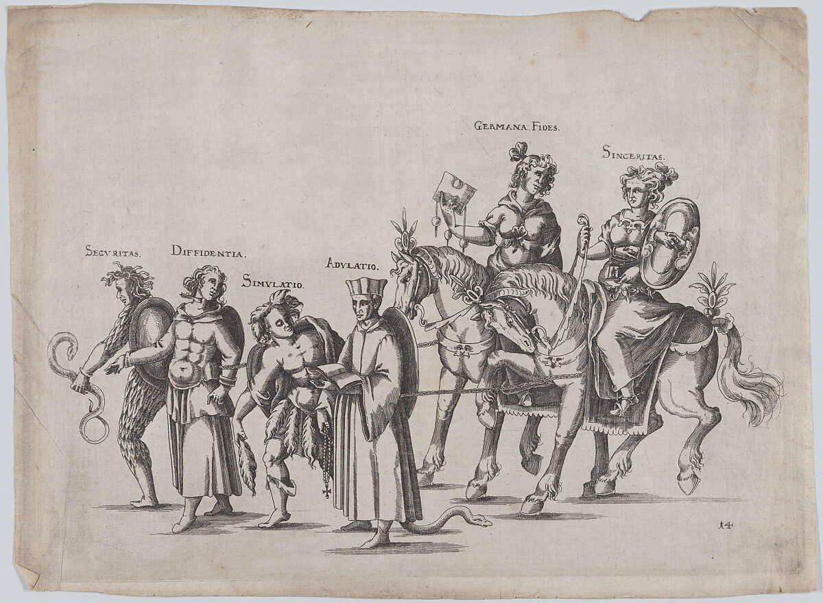 - Title: Plate 14: Six figures marching in a procession, two atop horses, a snake at bottom center; plate from 'Repraesentatio Der Fürstlichen Auffzug und Ritterspil... Herrn Johann Friderichen Hertzogen zu Württenberg und Teckh... und Fürstin Barbara Sophien ...' Stuttgart, November 6, 1609
