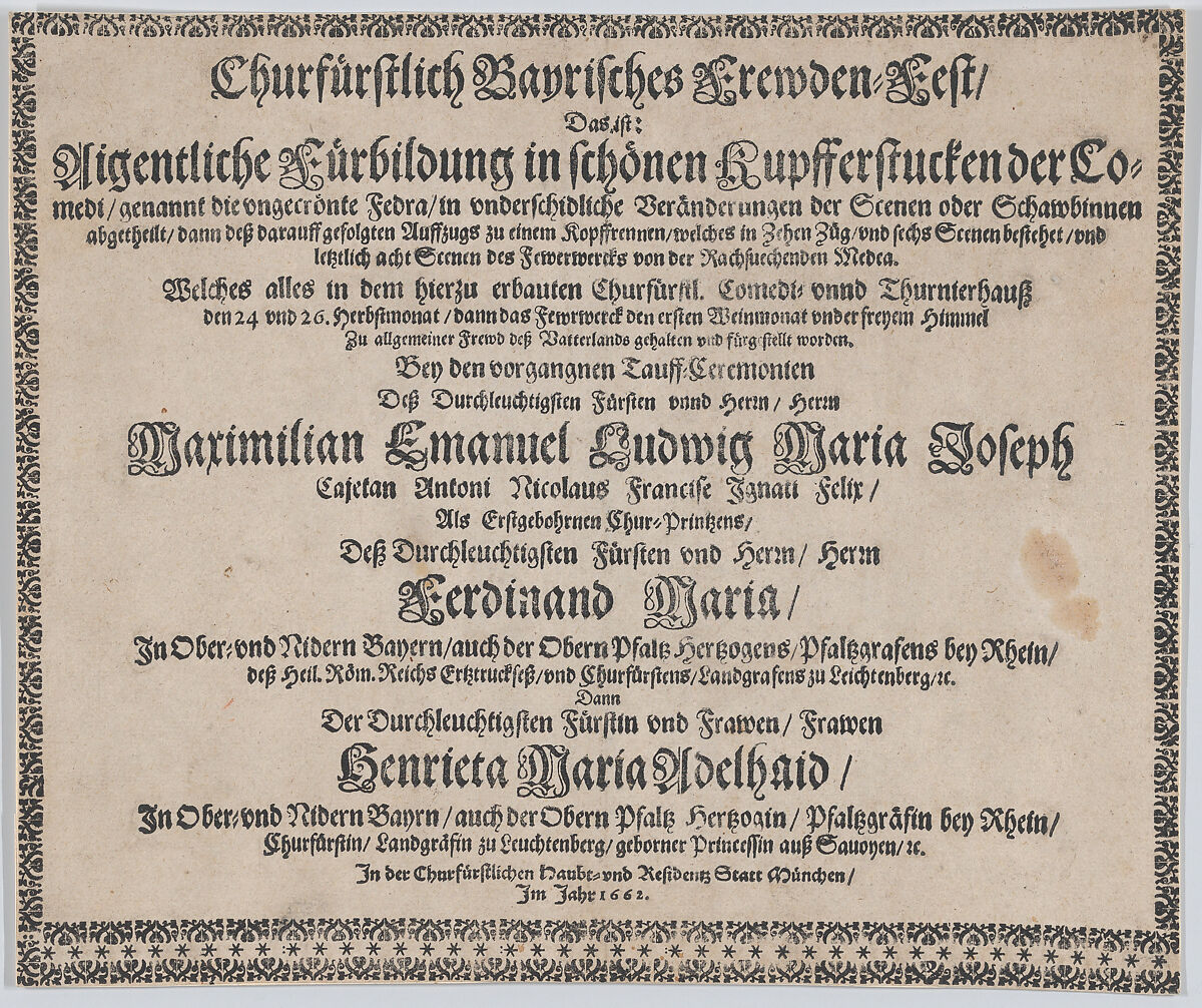 - Title: Text to accompany plate illustrating the fireworks display celebrating the birth of Prince Max Emmanuel of Bavaria, Munich, 1662
