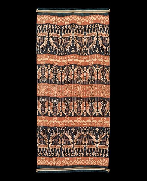 This example is particularly accomplished in the complexity and dynamism of its design that features paired sets of creatures drawn from the realms of land, sea and sky, and which can be identified as snakes, stags, fish, shrimps and wild fowl. The repeated symmetry of paired creatures reveals vivid new motifs when viewed from different positions, creating a lively and dynamic design. For example, paired shrimps around a single fish icon become the steady eyes and open mouth of a man when the fish icon is anchored as a central axis, emphasizing the inevitable presence of man and his ancestors in this overall scheme of life. Likewise the raised antlers and tail of each stag become lively and animated creatures which appear to be climbing when viewed upside down. This overlapping iconography creates a rich and visual play across the surface of the textile, allowing for embedded meanings to spring forth. A small, apparently decorative feature between each repeated set of raised antlers reveals itself to be a skull tree, a subtle allusion to the significance of headhunting in early Indonesian cultures. The capture and display of the skulls and jaws of defeated warriors from neighboring communities ensured the continued vitality and spiritual sustenance of a community. While headhunting was practiced throughout the Indonesian archipelago before its suppression by Dutch colonial authorities at the turn of the twentieth century, skull tree imagery remains unique to east Sumba and was incorporated into gold ear ornaments known as mamuli -- significant examples of which are also in the Oceania holdings of the Metropolitan Museum of Art (see 1990.335.3).