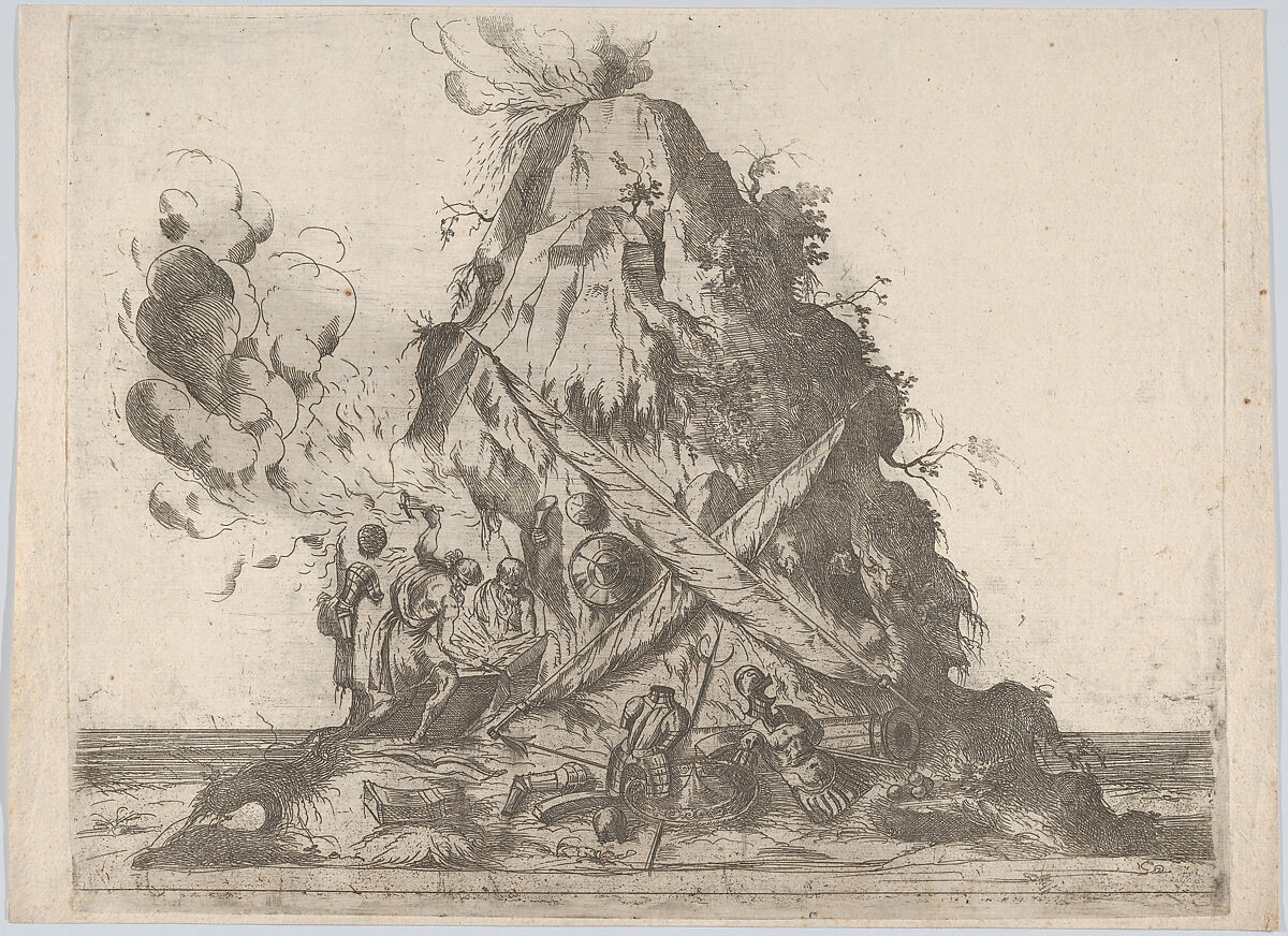 - Title: Volcano at center with blacksmiths working at left and armor on the ground around them