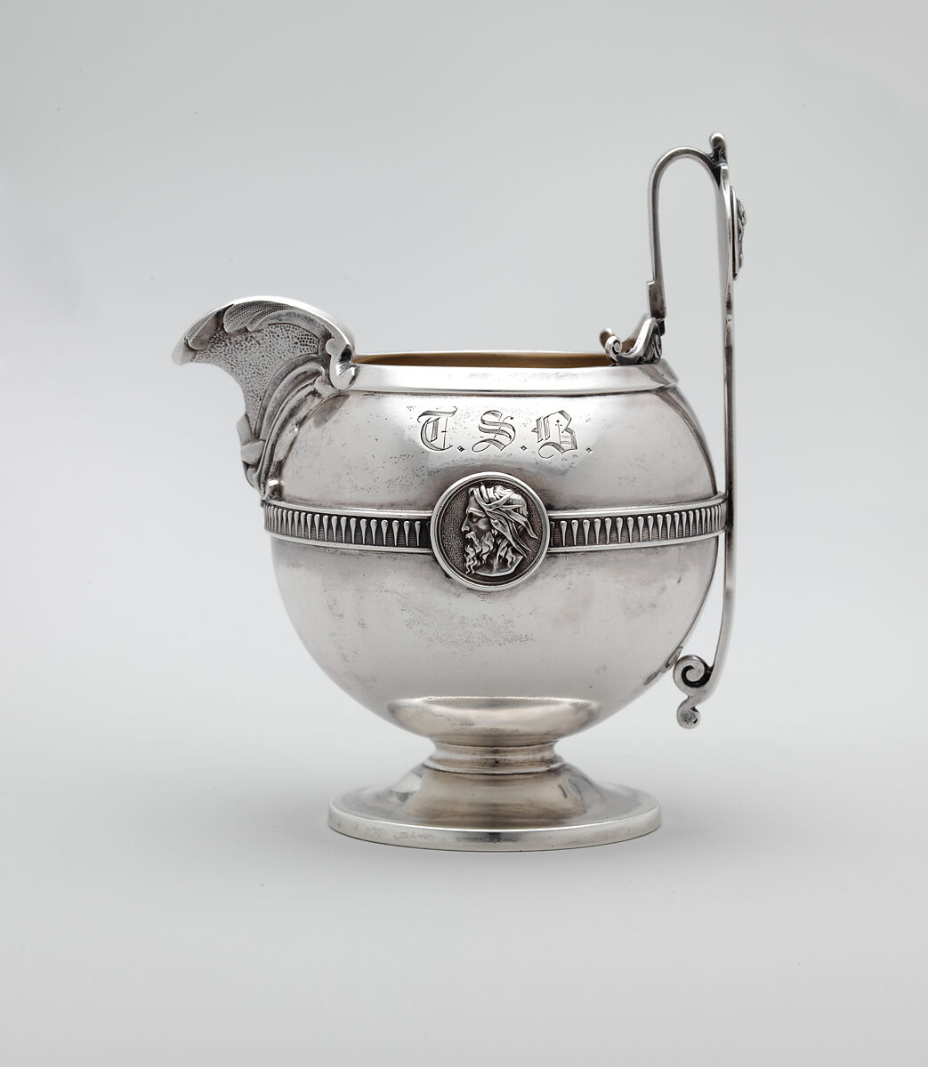 The mid-nineteenth century witnessed an efflorescence of creativity in the American silver industry, fueled by the burgeoning middle class’s increasing demand for refined luxury goods. Silversmiths devoted considerable time and creative energy to generating an endless variety of new designs and patterns. During the 1860s and 1870s silver flatware ornamented with portrait medallions inspired by antique coins and cameos enjoyed widespread popularity, with virtually every American silversmith producing their own proprietary "medallion" pattern. Gorham Manufacturing Company’s designer George Wilkinson patented a medallion flatware pattern in 1864, and the quantity and variety of surviving silver in this pattern attest to its success. Medallions from this flatware pattern ornament the tea set as well as a toast rack (.4) and goblet (.5) in the American Wing’s collection. Although the three pieces match, they are an assembled set; the teapot is engraved "Linda," and the creamer and sugar bowl are engraved "T. S. B." These objects would have been proudly displayed and used on the table as a testament to their owner’s taste and sophistication.