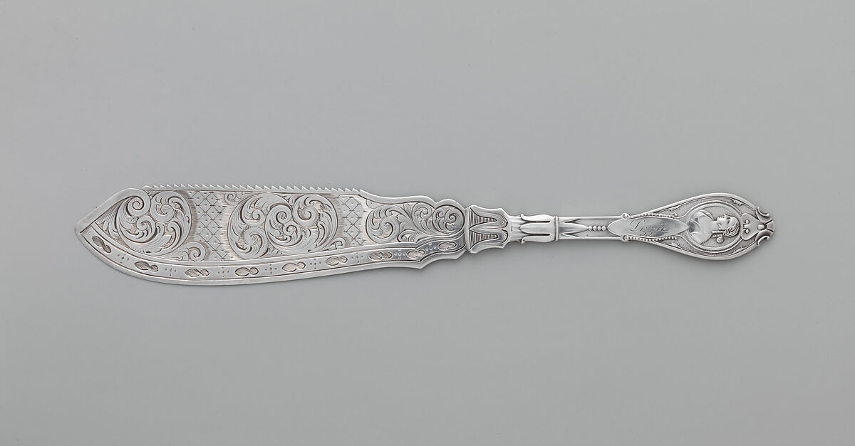 The mid-nineteenth century witnessed an efflorescence of creativity in the American silver industry, fueled by the burgeoning middle class’s increasing demand for refined luxury goods. Silversmiths devoted considerable time and creative energy to generating an endless variety of new designs and patterns. During the 1860s and 1870s silver flatware ornamented with portrait medallions inspired by antique coins and cameos enjoyed widespread popularity, with virtually every American silversmith producing their own proprietary "medallion" pattern. Although this cake saw cannot be attributed to a specific silversmith, the maker was clearly skilled and inventive, creating a medallion pattern that substitutes a contemporary figure for the traditional portrait of an ancient god, goddess, or warrior. The scrolling floral and vegetal designs on the blade further contribute to the charm and appeal of this object, a specialized flatware form designed to cut and serve cake.