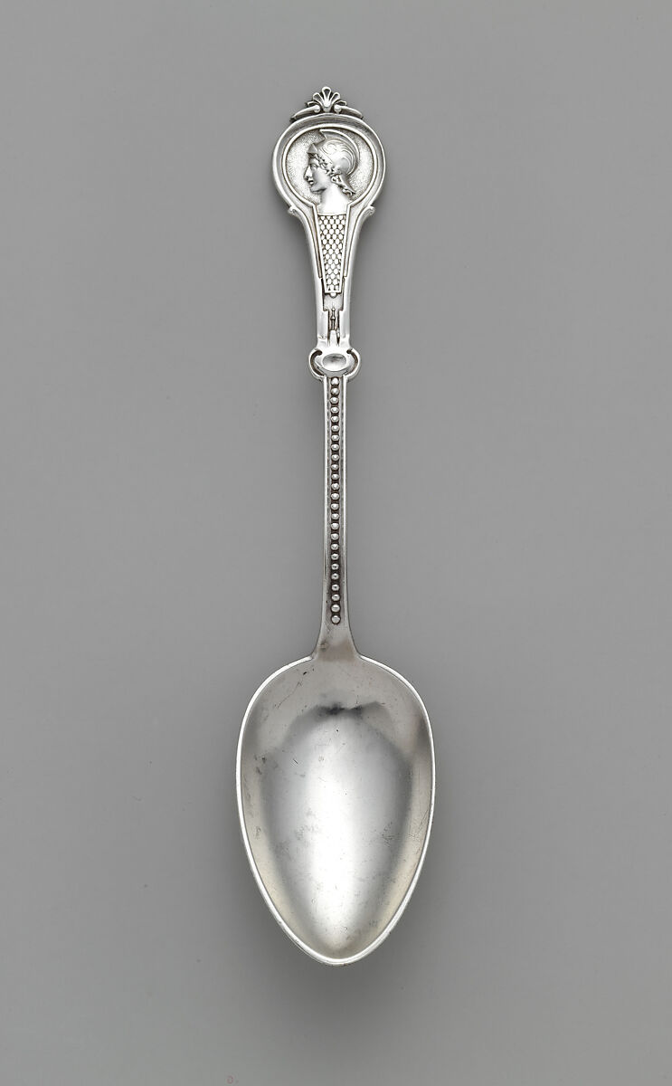 The mid-nineteenth century witnessed an efflorescence of creativity in the American silver industry, fueled by the burgeoning middle class’s increasing demand for refined luxury goods. Silversmiths devoted considerable time and creative energy to generating an endless variety of new designs and patterns. During the 1860s and 1870s silver flatware ornamented with portrait medallions inspired by antique coins and cameos enjoyed widespread popularity, with virtually every American silversmith producing their own proprietary "medallion" pattern. The New York firm of Wood and Hughes, one of the finest and largest manufacturers of American silver, created numerous flatware patterns during the second half of the nineteenth century, including several different medallion patterns. Known as "warrior," this pattern depicts various helmeted male figures, here a clean shaven youth with a square jaw and prominent Roman nose. Note the meticulously executed details, characteristic features of Wood and Hughes’s work.