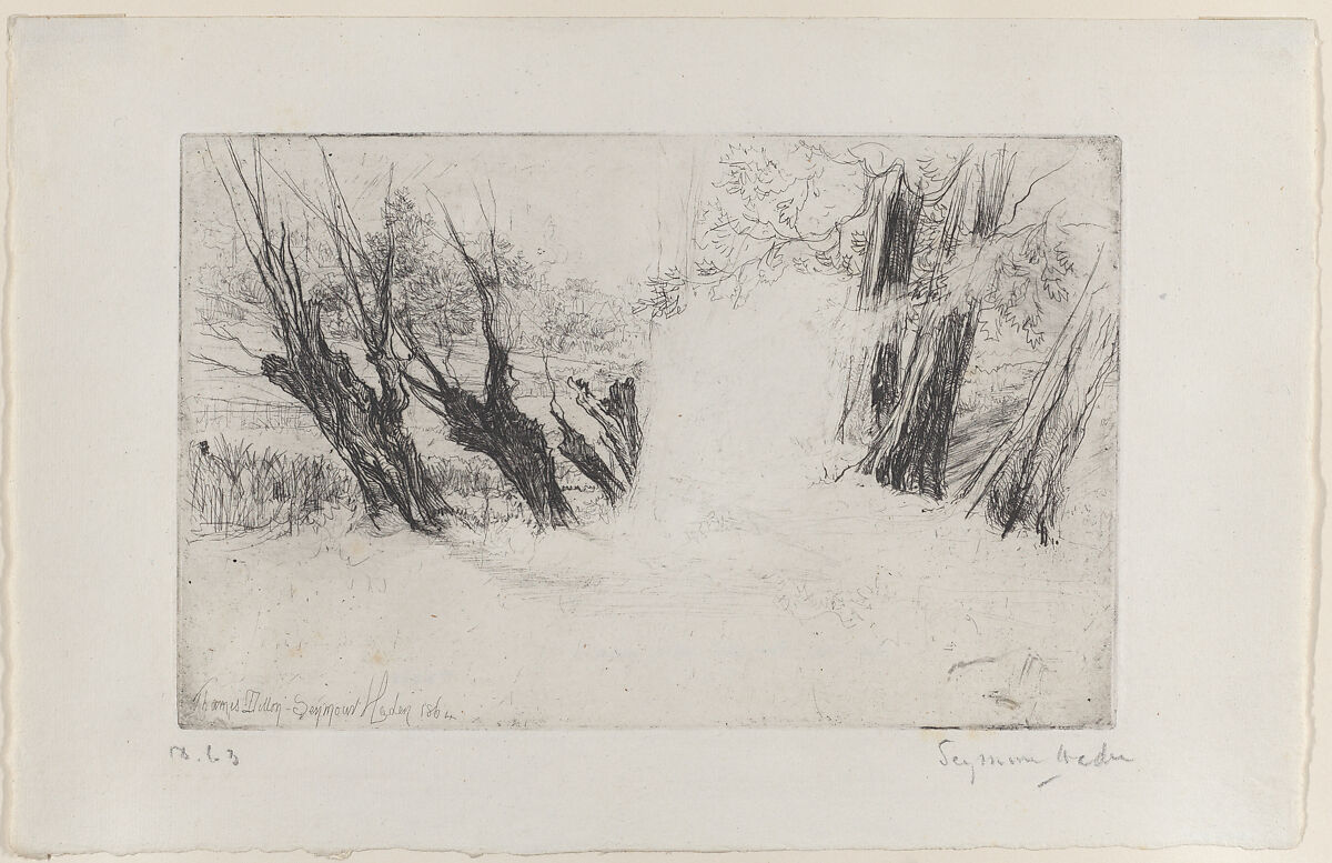 "Trial Proofs: (a) The tree stems are alone indicated, and the willows throw shadows towards the right. 'Thames Ditton, Seymour Haden 1864.' Coll. H."