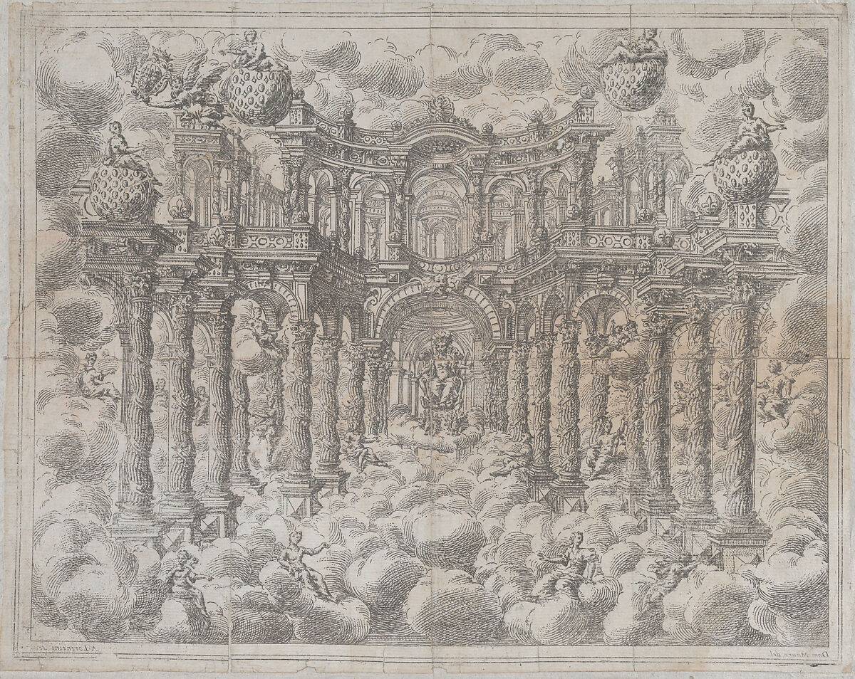 - Title: Plate 2 [counterproof]; stage set with allegorical figures seated among the clouds, with a large colonnade in the background; from Aurelio Aureli's "Il Favore De Gli Dei"