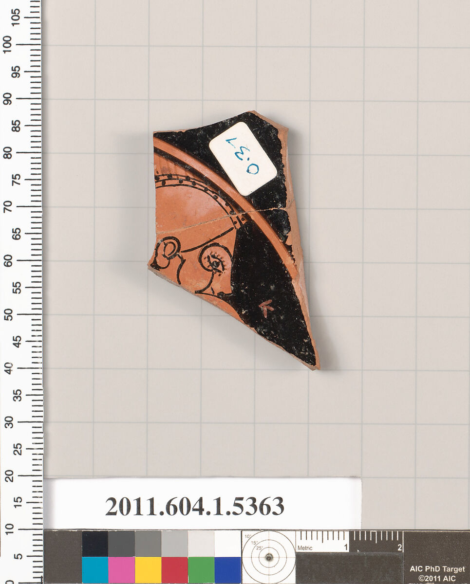 Interior, head and right shoulder of helmeted warrior to right; one letter of an inscription, K