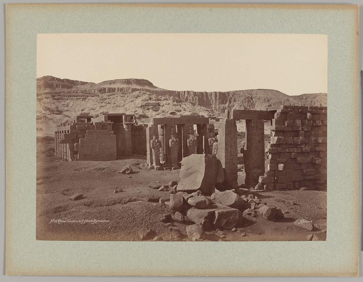 Émile Béchard remains a mysterious figure, primarily because of the signature "H. Béchard," which appears in the negatives of most of his landscape and architectural work, including in this view of the Ramesseum. Since the late 1980s, many historians had believed that there were in fact two photographers, Émile and "Henri" Béchard, both operating in Egypt. More recently, scholars have instead hypothesized that perhaps Émile adopted this second name to distinguish the different subjects of his various series (i.e. portraits versus monuments). The identification of a brother named Hippolyte Béchard, however, has led to a more logical explanation that Hippolyte sold and distributed Emile’s photographs in France. The situation, however, has been further complicated by a group of photographs sold in October 2015 at the chateau de Saint-Brisson in Saint Brisson-sur-Loire, France. Inscriptions on some of the prints indicate that Hippolyte Béchard was in Cairo in 1870, giving some credence to Ken Jacobson’s suggestion that Hippolyte Délié was not only Emile’s business partner but possibly also his brother, Hippolyte Béchard, who had, for some reason, changed his name. The shifting identities associated with the "Maison Béchard" are a prime example of the difficulties often associated with the attribution of 19th-century commercial photography.