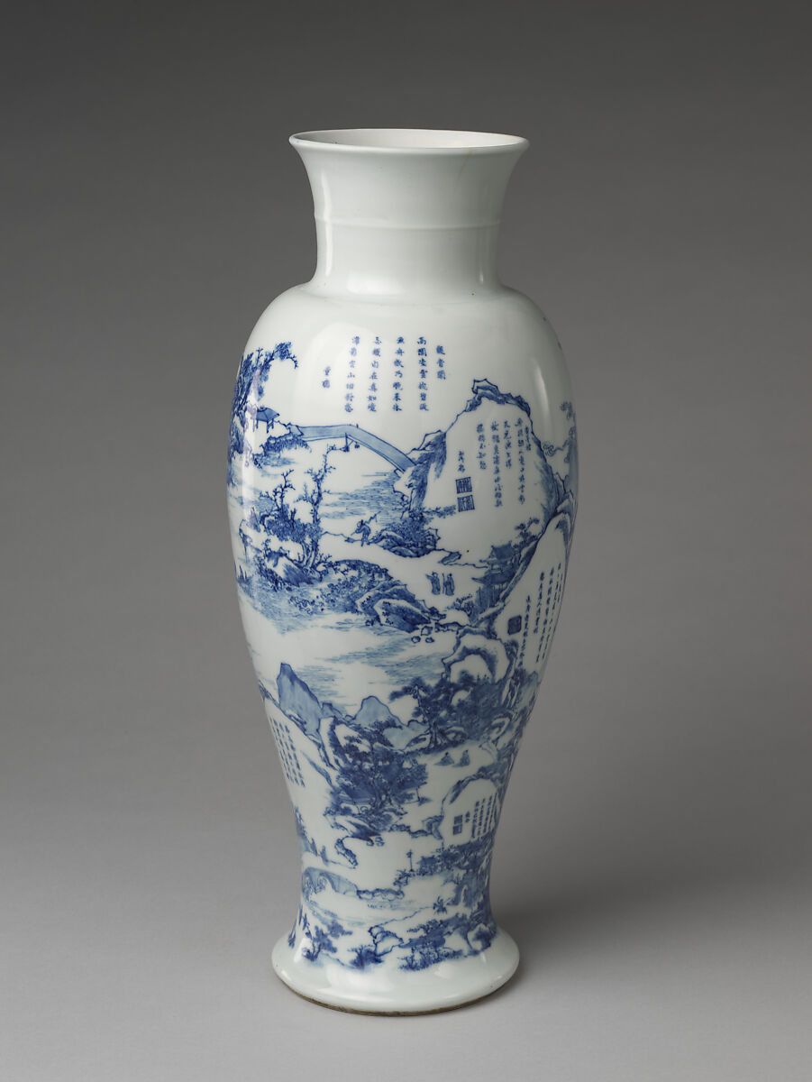 This vase is a unique memento of a literary gathering at the ceramic production center Jingdezhen, Jiangxi Province, in the 1690s. Its surface is richly decorated with figure groups and local scenic sites, all rendered with precision and sensitivity. Most remarkable are the transcriptions of an essay and ten poems that grace the sky and the rock faces. Collectively they relate a true story of strangers becoming friends across traditional class boundaries. A visiting official named Shang Ancun, known for his poems on local scenery, met two local scholars who presented their own poems on the subject, and friendship was born. In their company was a master potter also adept at poetry and painting. He painted the vase, including the transcriptions of poems composed on the occasion (one by him), thereby transforming a private exchange into a lasting artwork.