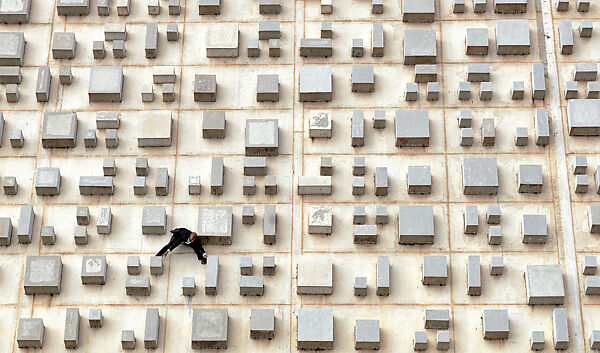 This striking photograph by French artist Vincent Fournier, part of his 2012 series Brasilia, portrays the sculptural facade of the National Theater of Brasilia. Completed in 1966, the theater is the largest arts building in Brasilia designed by the Brazilian architect Oscar Niemeyer (1907-2012). The composition and framing creates an image where neither verticality nor horizontality can be clearly differentiated. This lack of perspective, coupled with the figure of the man at lower left center, produces the illusion of the geometrically patterned façade as a floor, portraying the friction between the human presence and the materiality of the building.