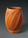 Kibe Seihō, one of Honda Shōryū’s students, prefers functional vessels and employs classical plaiting techniques, albeit in the service of unexpected and innovative effects. The outer layer of Echo of Rain, for example, is made with the thousand-line technique, while the inner structure consists of a type of mat plaiting. Remarkably, Kibe began his career as a bamboo artist later in life, after working as a gas station attendant, and had no previous art education. He nonetheless mastered the traditional styles and techniques of basket making, and has nurtured a distinctive, award-winning style characterized by a quiet subtlety and complex, layered textures.