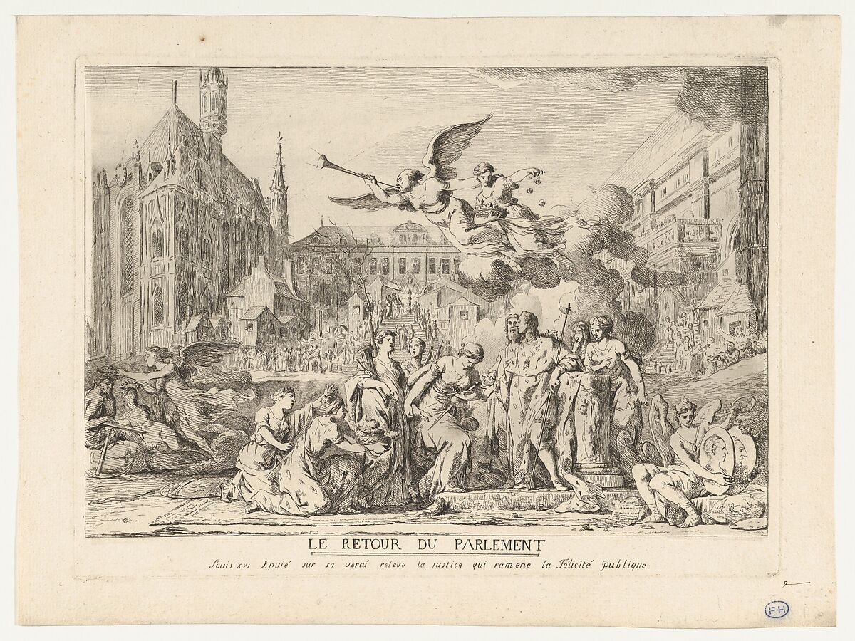 The image glorifies the decision of Louis XVI in 1774 to reconstitute the Parliament of Paris by recalling the magistrates who had been arrested and exiled three years earlier. The scene is set on the Île de la Cité, in the medieval heart of the city. The location is the courtyard of the Hall of Justice (Palais de Justice), with Sainte-Chapelle, a royal chapel in the gothic style, on the left.