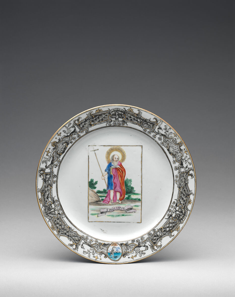 This plate, which depicts Saint Philip, originally belonged to a set of dishes illustrating Christ’s apostles as well as John the Baptist. The Chinese potters likely used images from European prayer books as sources for the portraits. Also European in origin is the distinctive border design, although no source has yet been identified.
