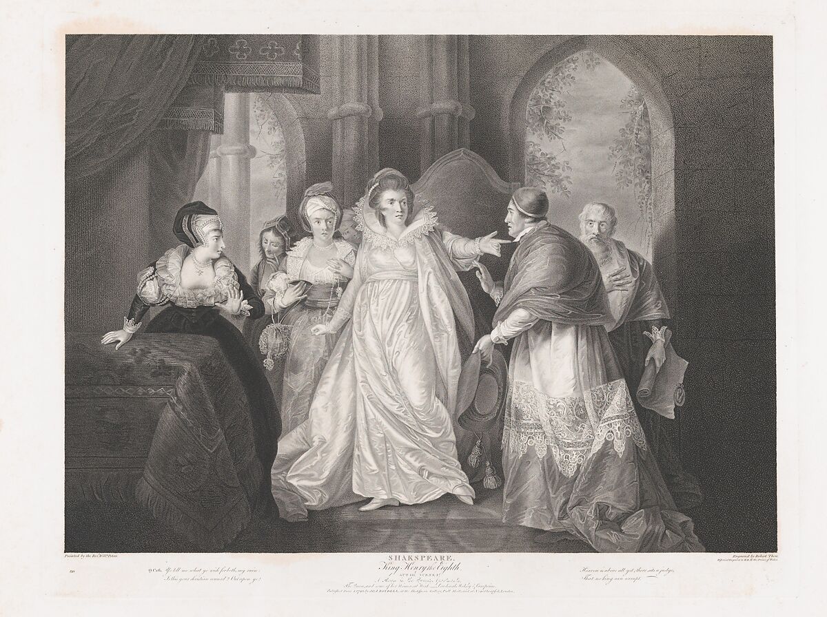 Peter's work encapsulates a Catherine of Aragon's angry meeting with Cardinal Wolsey in King Henry VIII. It was conceived for John Boydell's Shakespeare Gallery, launched in 1786 as a publishing-cum-exhibition scheme that included a new illustrated edition of the plays, sets of large and small engravings, and a gallery on London's Pall Mall. The latter opened in 1789 with thirty-four paintings and contained about one hundred and seventy works the time Boydell went bankrupt and auctioned the contents in 1805–his print sales plummeted when Napoleon blocaded European ports. This impression belongs to an American reissue of 1852 spearheaded by Shearjashub Spooner, a New York dental surgeon, writer and art scholar who acquired Boydell's heavily worn plates and had them reworked. Printed on thick cream colored paper, the New York edition added small numbers in the lower left margin, this being number 80.